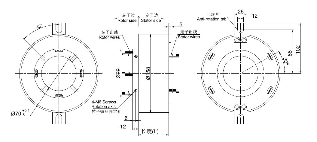• · 外徑158mm, 通孔直徑為70mm(適用于<=70mm)的標(biāo)準(zhǔn)系列整體式精密導(dǎo)電滑環(huán)。*注意:如需<70mm的內(nèi)孔,可通過(guò)加內(nèi)襯軸套解決。